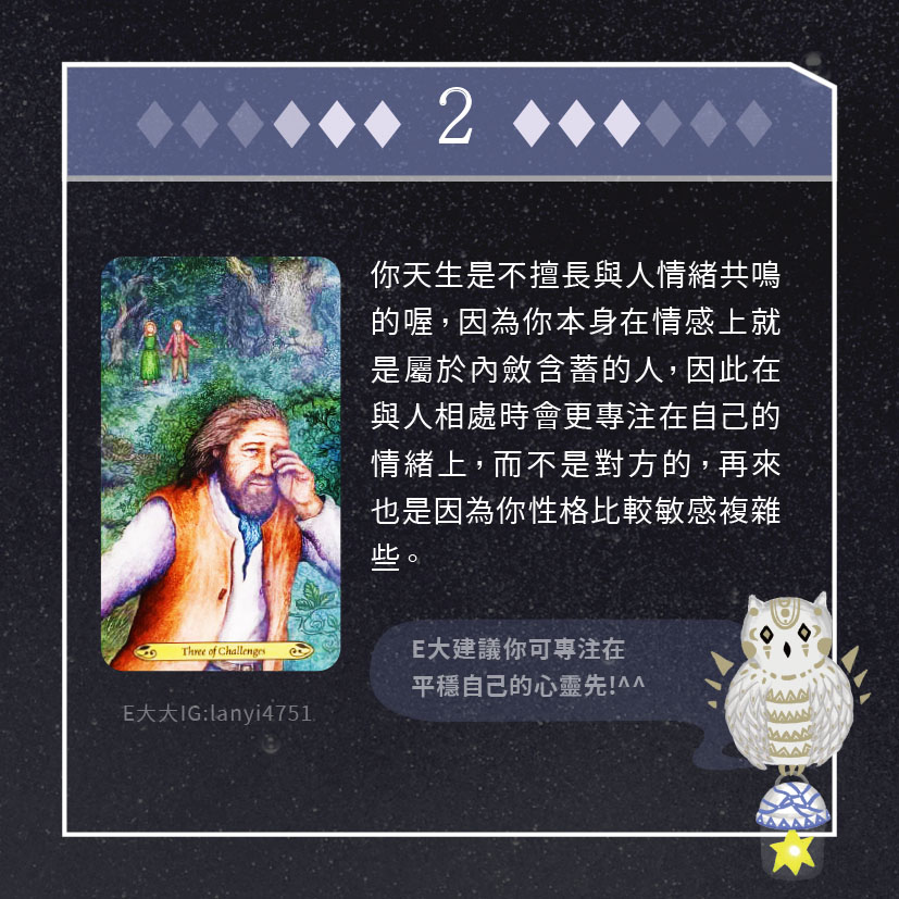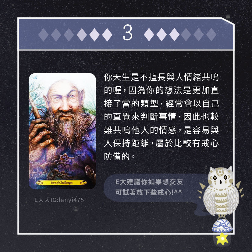 嗨~我是E大,歡迎你來到我的塔羅世界,每天會跟大家分享有趣的塔牌測驗,及塔羅知識喔!