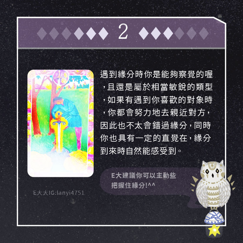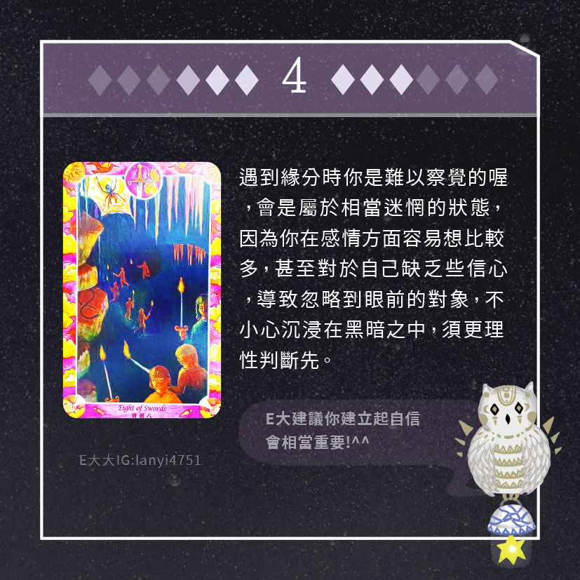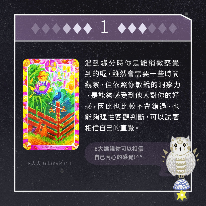 嗨~我是E大,歡迎你來到我的塔羅世界,每天會跟大家分享有趣的塔牌測驗,及塔羅知識喔!
