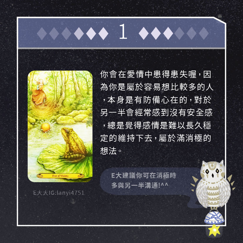 嗨~我是E大,歡迎你來到我的塔羅世界,每天會跟大家分享有趣的塔牌測驗,及塔羅知識喔!