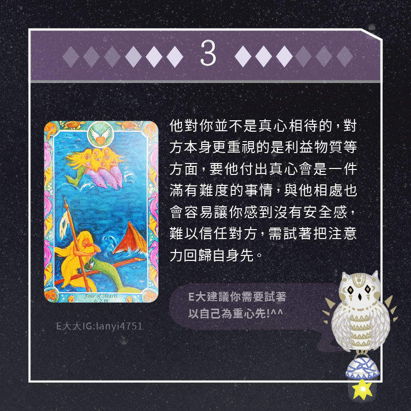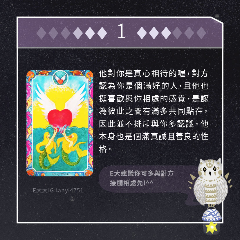 嗨~我是E大,歡迎你來到我的塔羅世界,每天會跟大家分享有趣的塔牌測驗,及塔羅知識喔!
