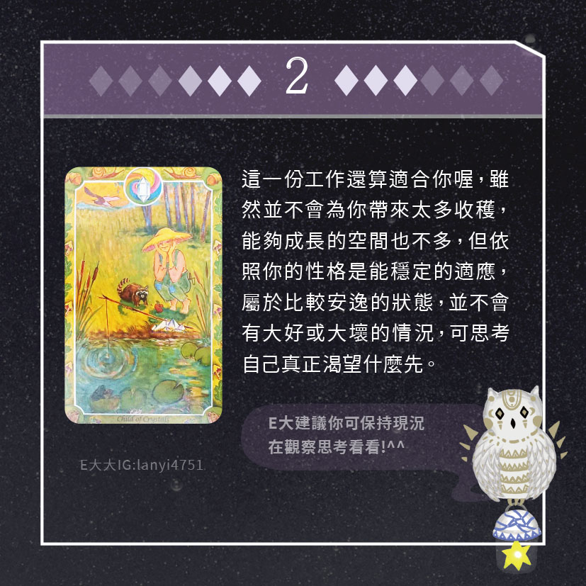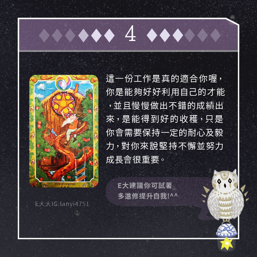 嗨~我是E大,歡迎你來到我的塔羅世界,每天會跟大家分享有趣的塔牌測驗,及塔羅知識喔!