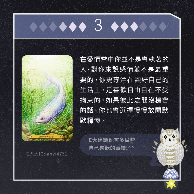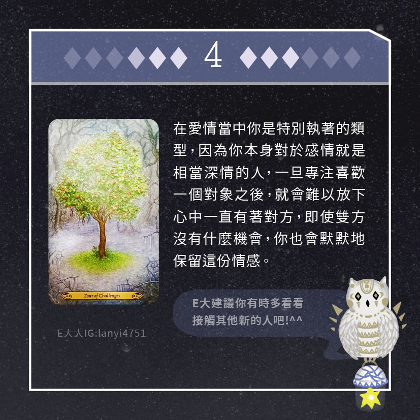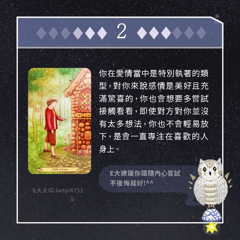 嗨~我是E大,歡迎你來到我的塔羅世界,每天會跟大家分享有趣的塔牌測驗,及塔羅知識喔!