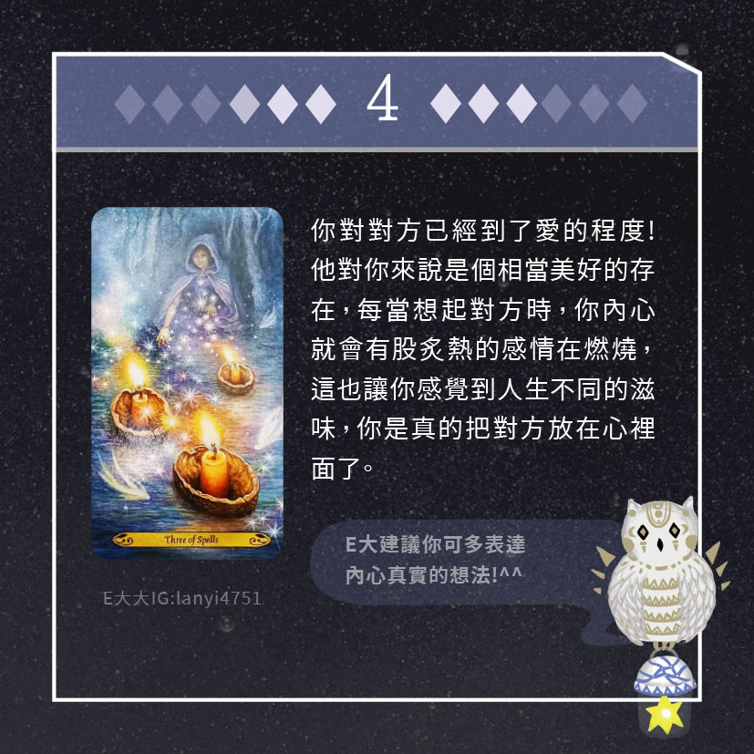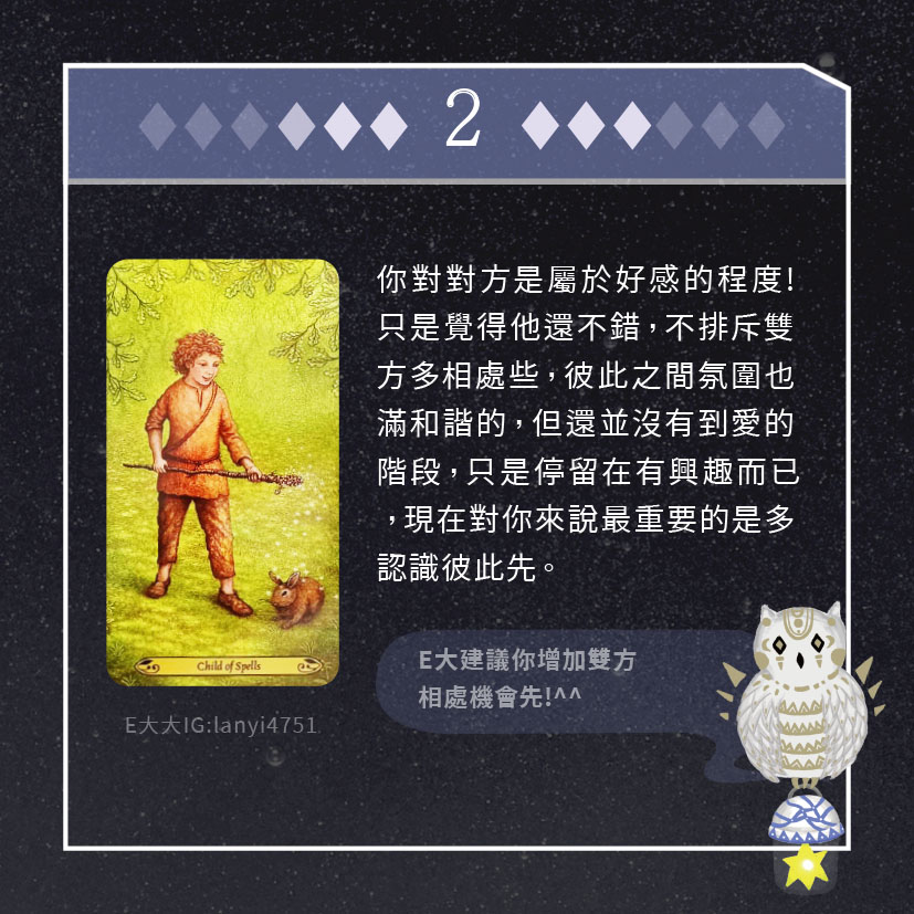 嗨~我是E大,歡迎你來到我的塔羅世界,每天會跟大家分享有趣的塔牌測驗,及塔羅知識喔!