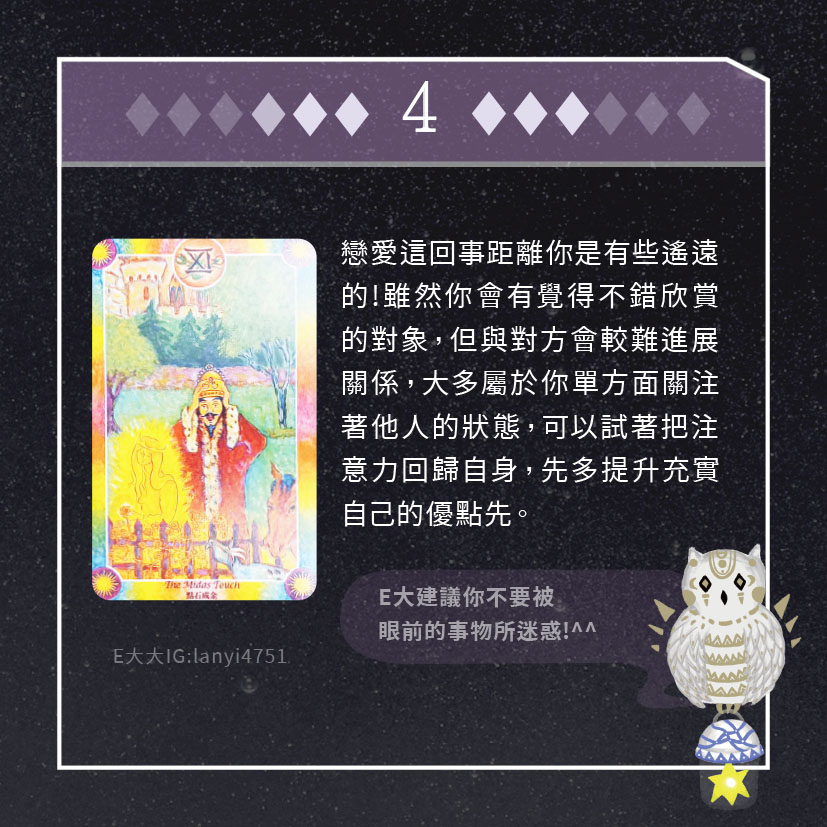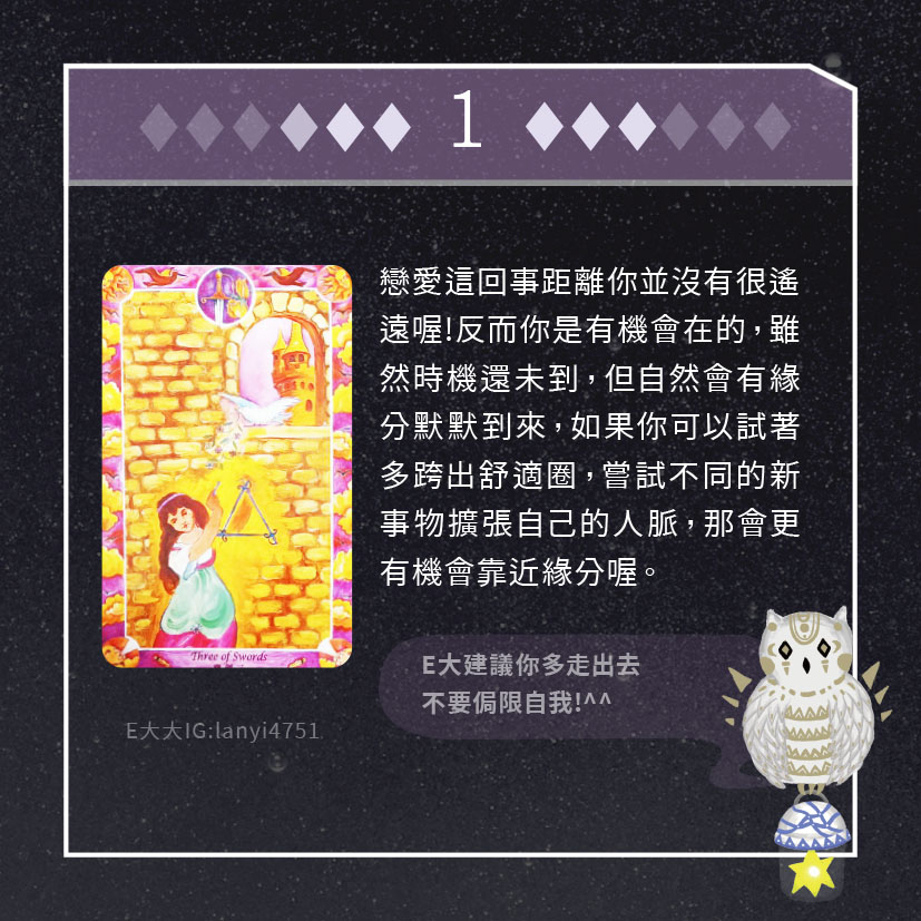 嗨~我是E大,歡迎你來到我的塔羅世界,每天會跟大家分享有趣的塔牌測驗,及塔羅知識喔!