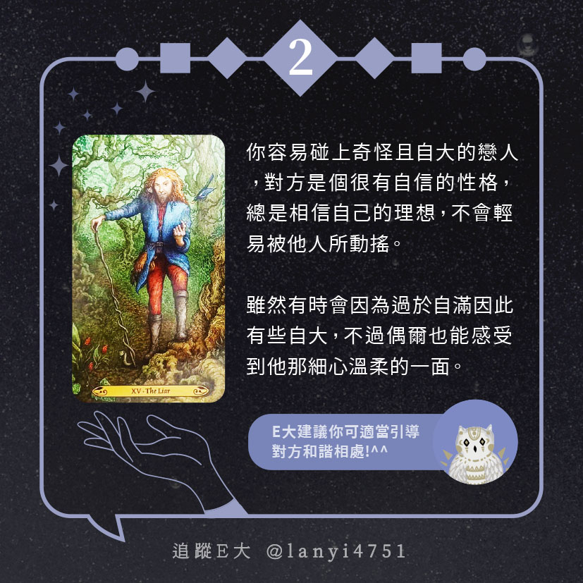 嗨~我是E大,歡迎你來到我的塔羅世界,每天會跟大家分享有趣的塔牌測驗,及塔羅知識喔!