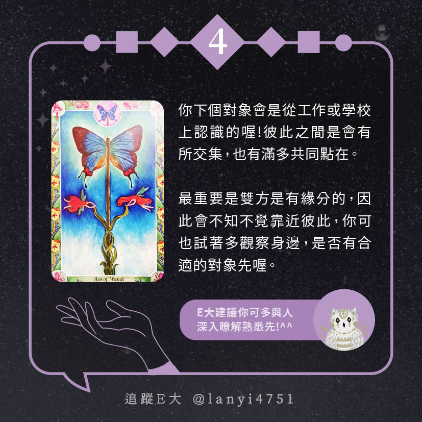 嗨~我是E大,歡迎你來到我的塔羅世界,每天會跟大家分享有趣的塔牌測驗,及塔羅知識喔!