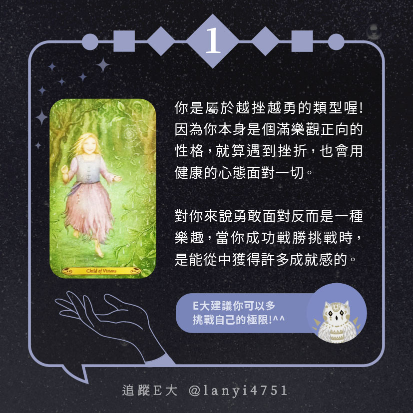 嗨~我是E大,歡迎你來到我的塔羅世界,每天會跟大家分享有趣的塔牌測驗,及塔羅知識喔!
