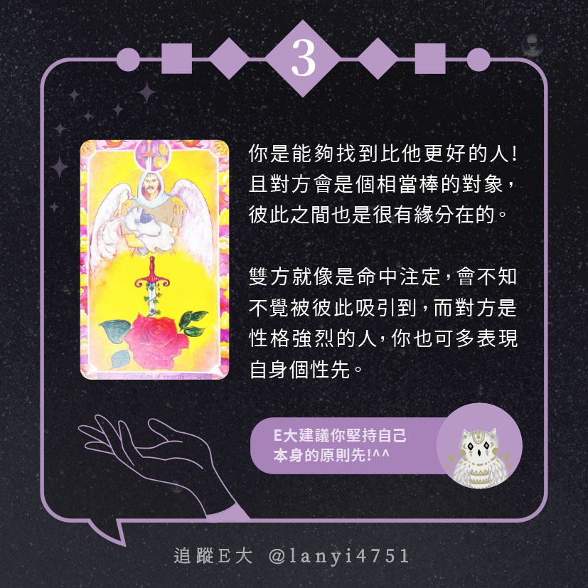 嗨~我是E大,歡迎你來到我的塔羅世界,每天會跟大家分享有趣的塔牌測驗,及塔羅知識喔!