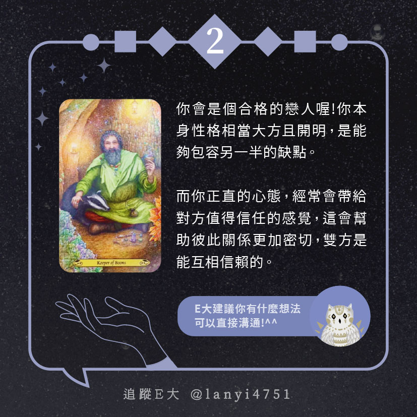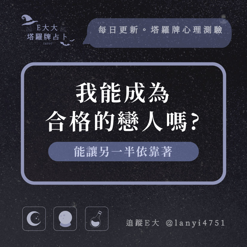 嗨~我是E大,歡迎你來到我的塔羅世界,每天會跟大家分享有趣的塔牌測驗,及塔羅知識喔!