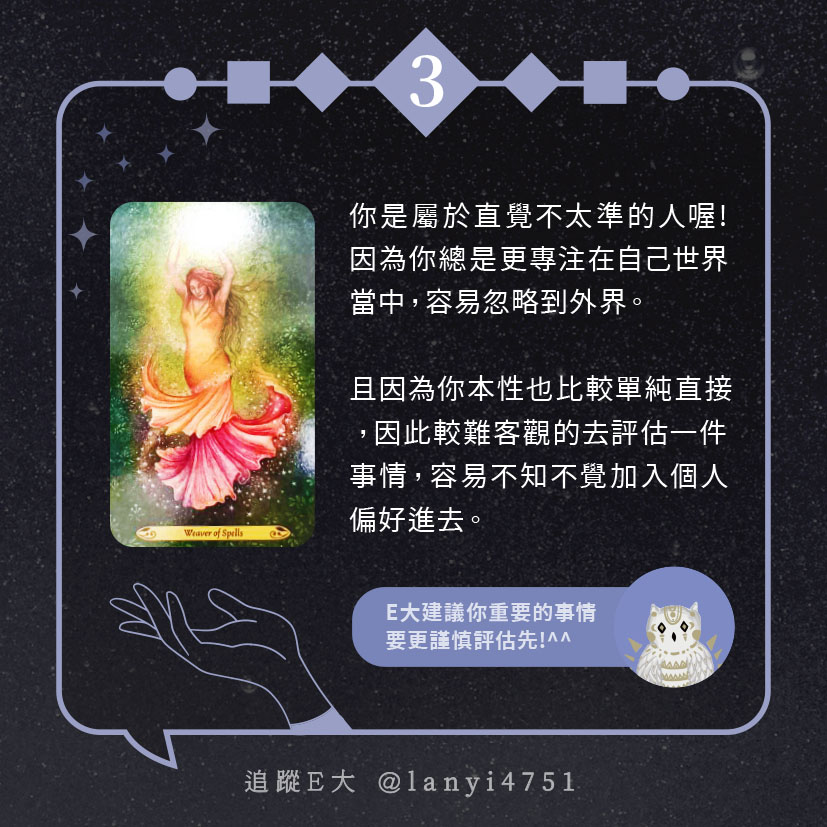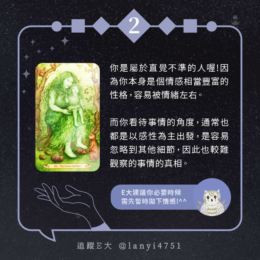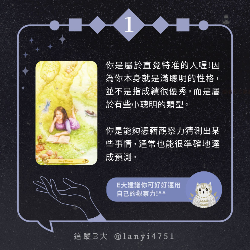 嗨~我是E大,歡迎你來到我的塔羅世界,每天會跟大家分享有趣的塔牌測驗,及塔羅知識喔!