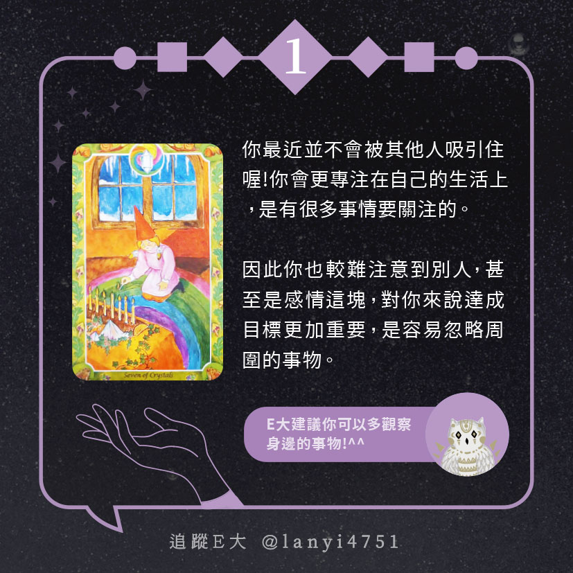 嗨~我是E大,歡迎你來到我的塔羅世界,每天會跟大家分享有趣的塔牌測驗,及塔羅知識喔!