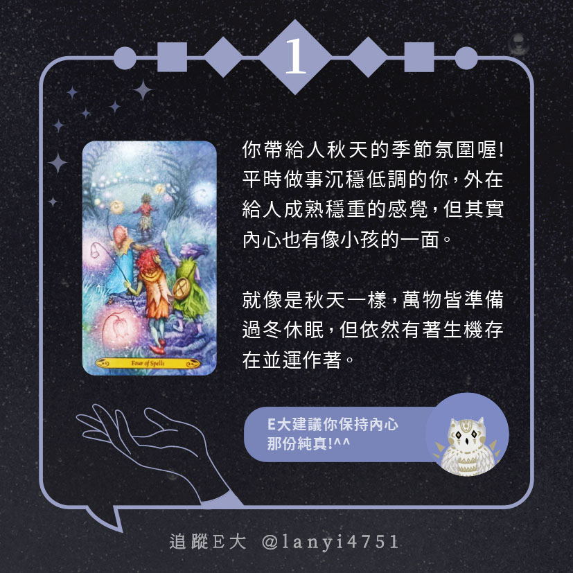 嗨~我是E大,歡迎你來到我的塔羅世界,每天會跟大家分享有趣的塔牌測驗,及塔羅知識喔!