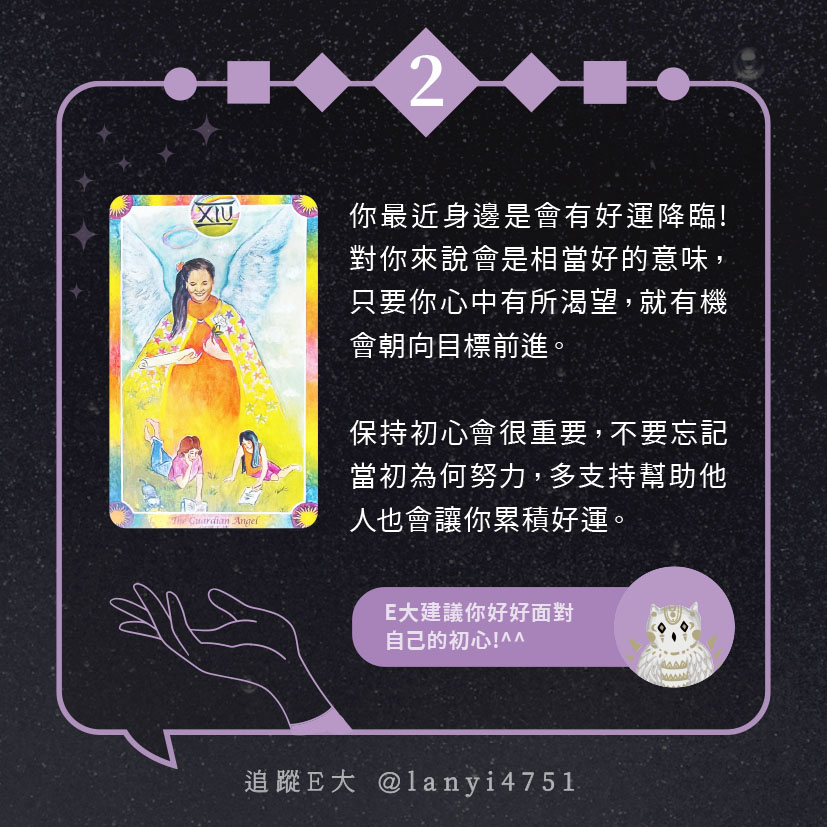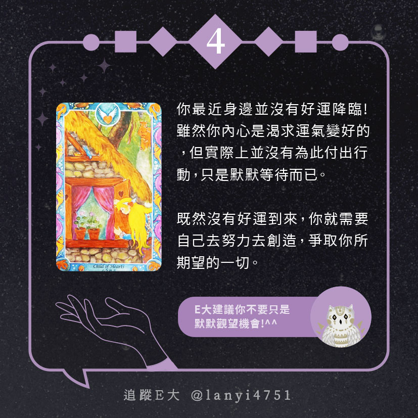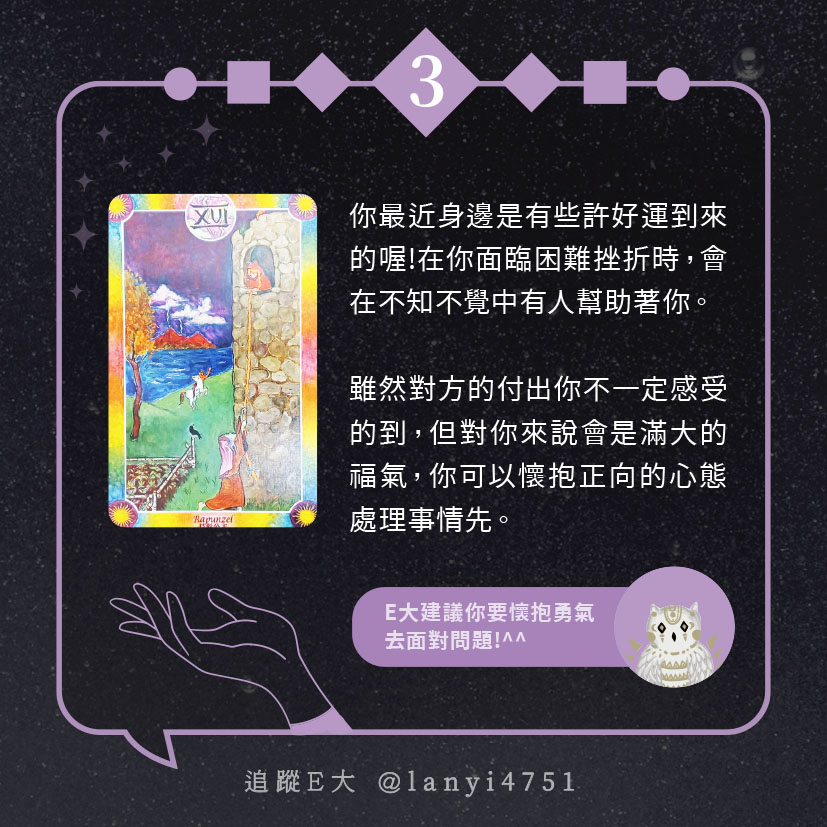 嗨~我是E大,歡迎你來到我的塔羅世界,每天會跟大家分享有趣的塔牌測驗,及塔羅知識喔!