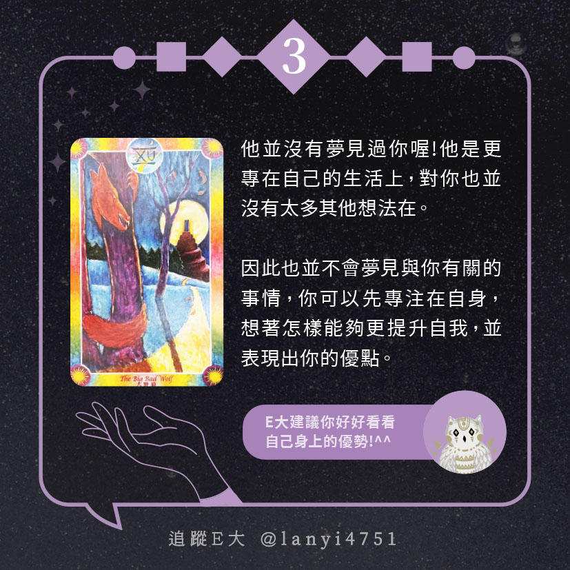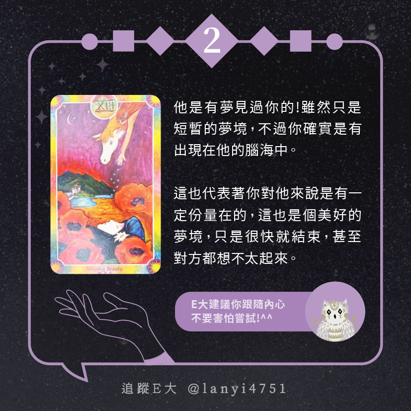 嗨~我是E大,歡迎你來到我的塔羅世界,每天會跟大家分享有趣的塔牌測驗,及塔羅知識喔!