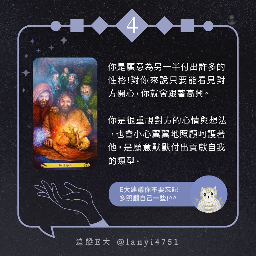 嗨~我是E大,歡迎你來到我的塔羅世界,每天會跟大家分享有趣的塔牌測驗,及塔羅知識喔!