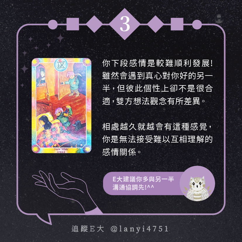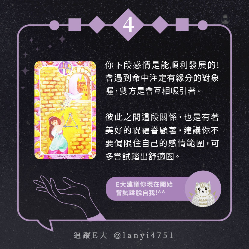 嗨~我是E大,歡迎你來到我的塔羅世界,每天會跟大家分享有趣的塔牌測驗,及塔羅知識喔!