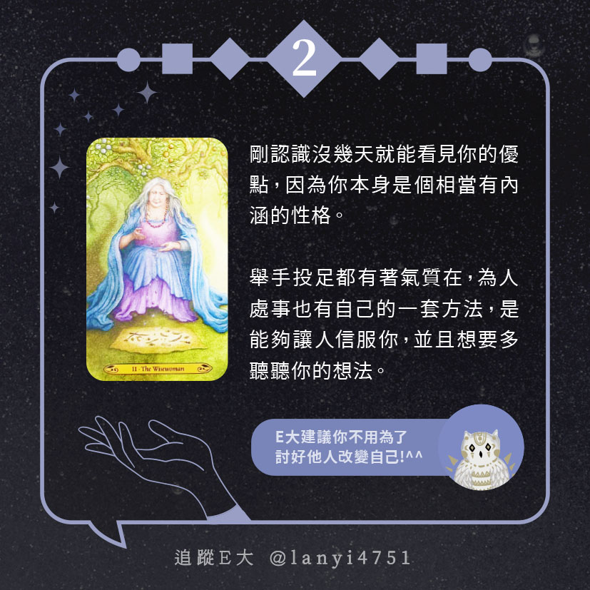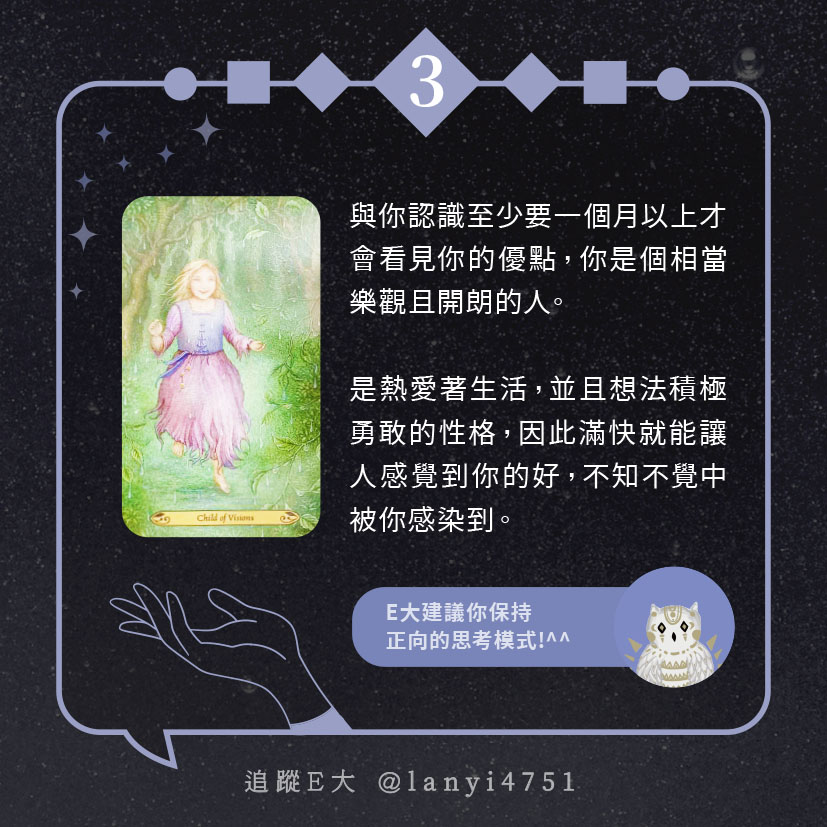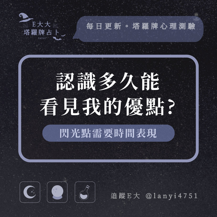 嗨~我是E大,歡迎你來到我的塔羅世界,每天會跟大家分享有趣的塔牌測驗,及塔羅知識喔!
