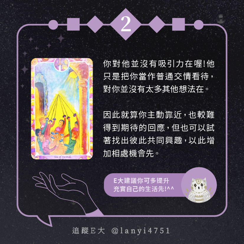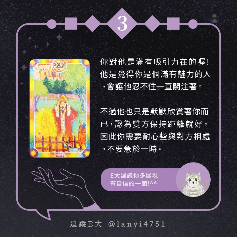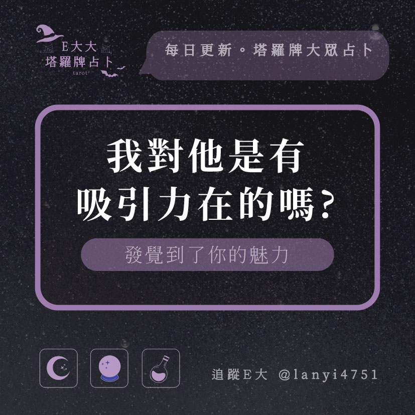 嗨~我是E大,歡迎你來到我的塔羅世界,每天會跟大家分享有趣的塔牌測驗,及塔羅知識喔!