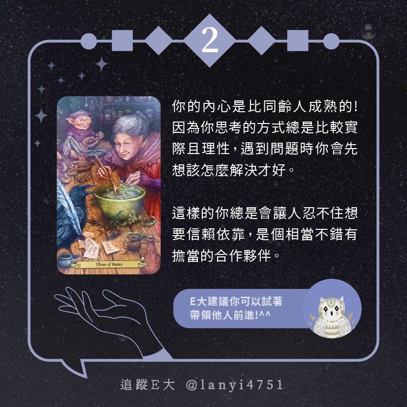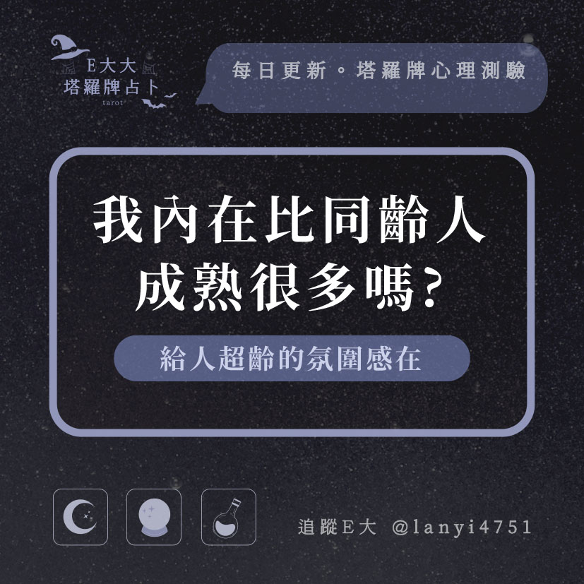 嗨~我是E大,歡迎你來到我的塔羅世界,每天會跟大家分享有趣的塔牌測驗,及塔羅知識喔!