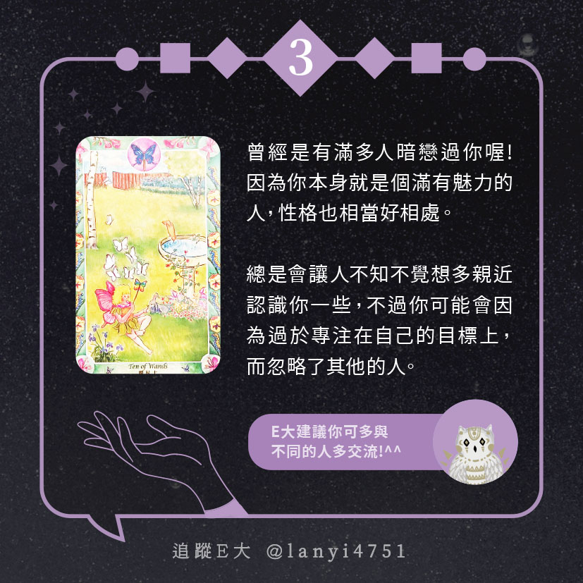 嗨~我是E大,歡迎你來到我的塔羅世界,每天會跟大家分享有趣的塔牌測驗,及塔羅知識喔!