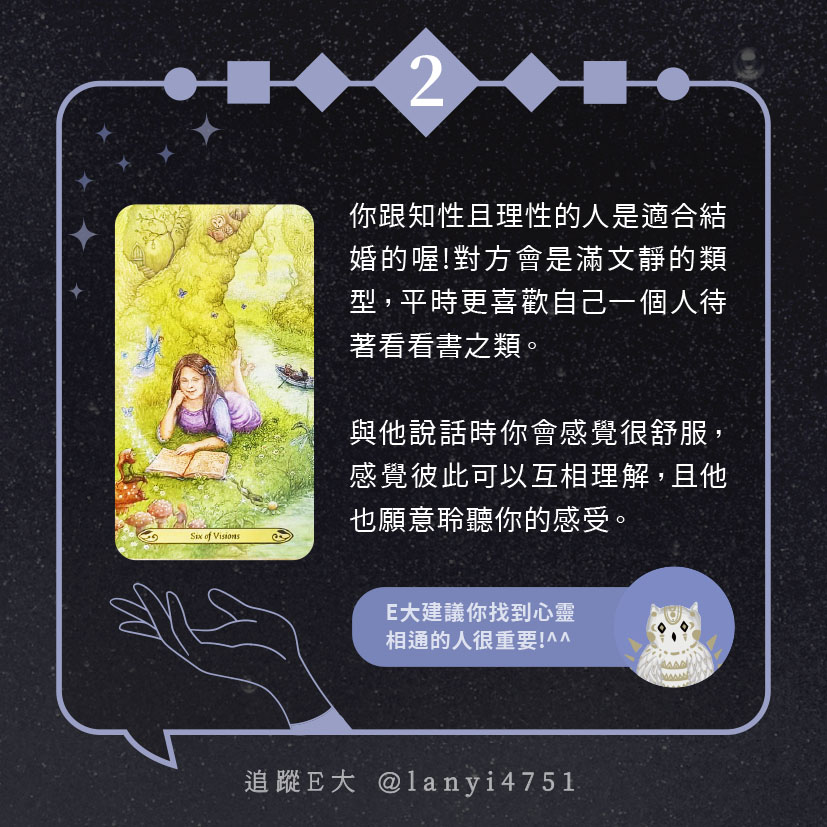 嗨~我是E大,歡迎你來到我的塔羅世界,每天會跟大家分享有趣的塔牌測驗,及塔羅知識喔!