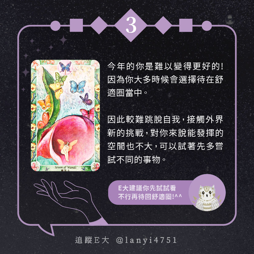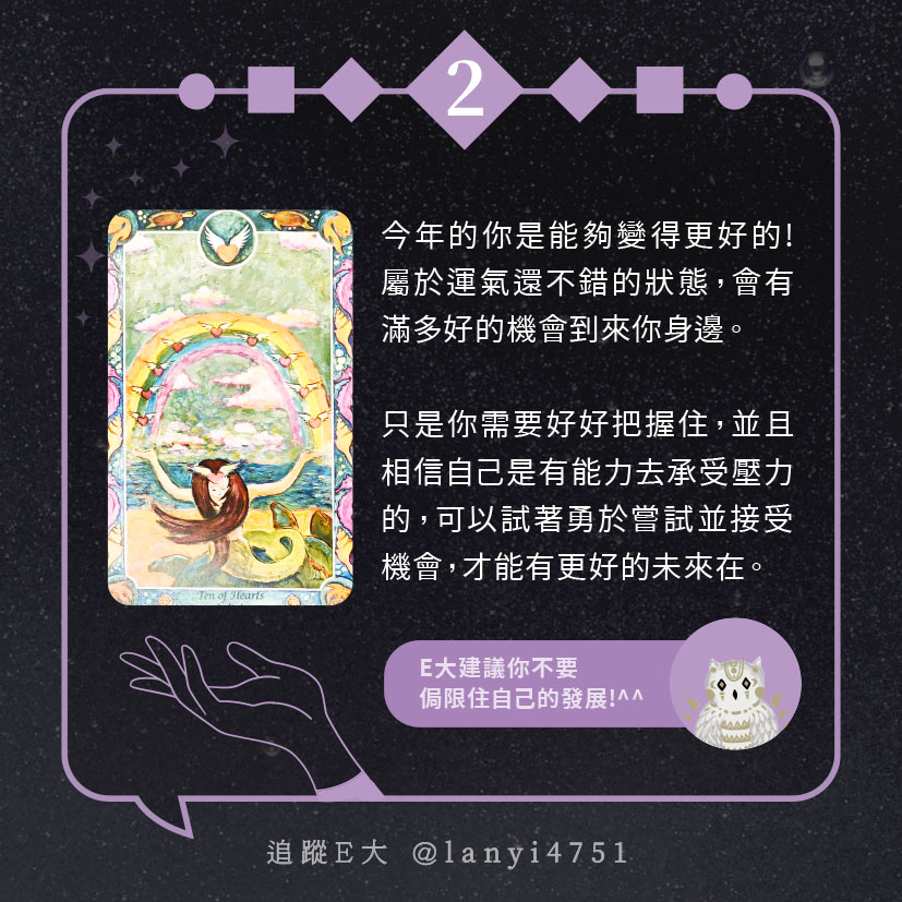 嗨~我是E大,歡迎你來到我的塔羅世界,每天會跟大家分享有趣的塔牌測驗,及塔羅知識喔!