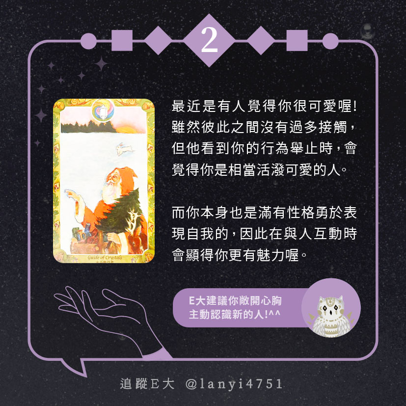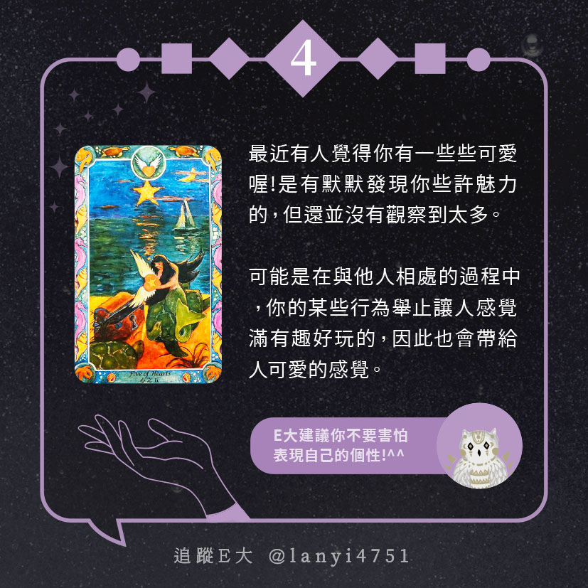 嗨~我是E大,歡迎你來到我的塔羅世界,每天會跟大家分享有趣的塔牌測驗,及塔羅知識喔!