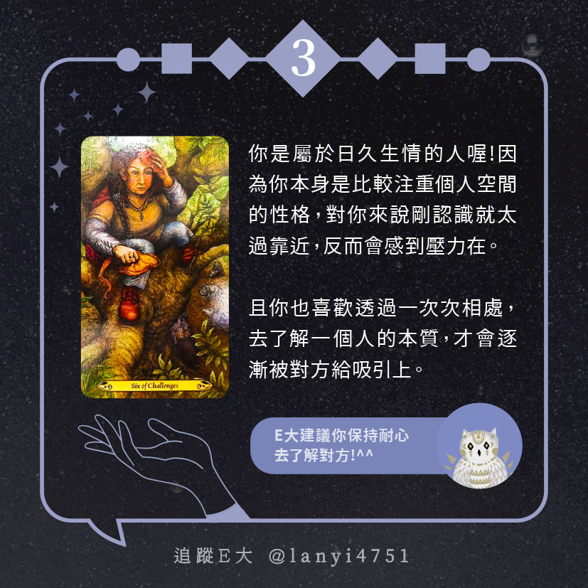 嗨~我是E大,歡迎你來到我的塔羅世界,每天會跟大家分享有趣的塔牌測驗,及塔羅知識喔!