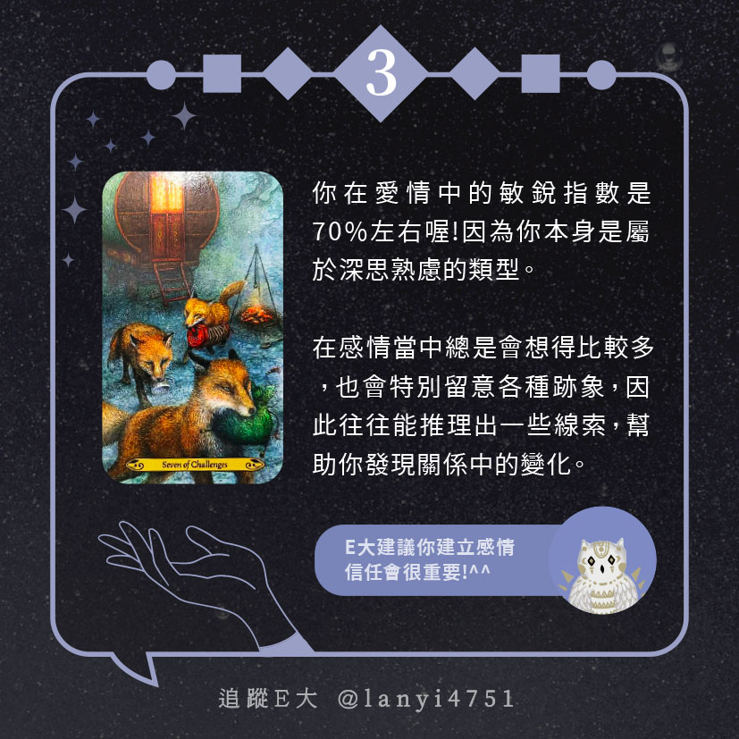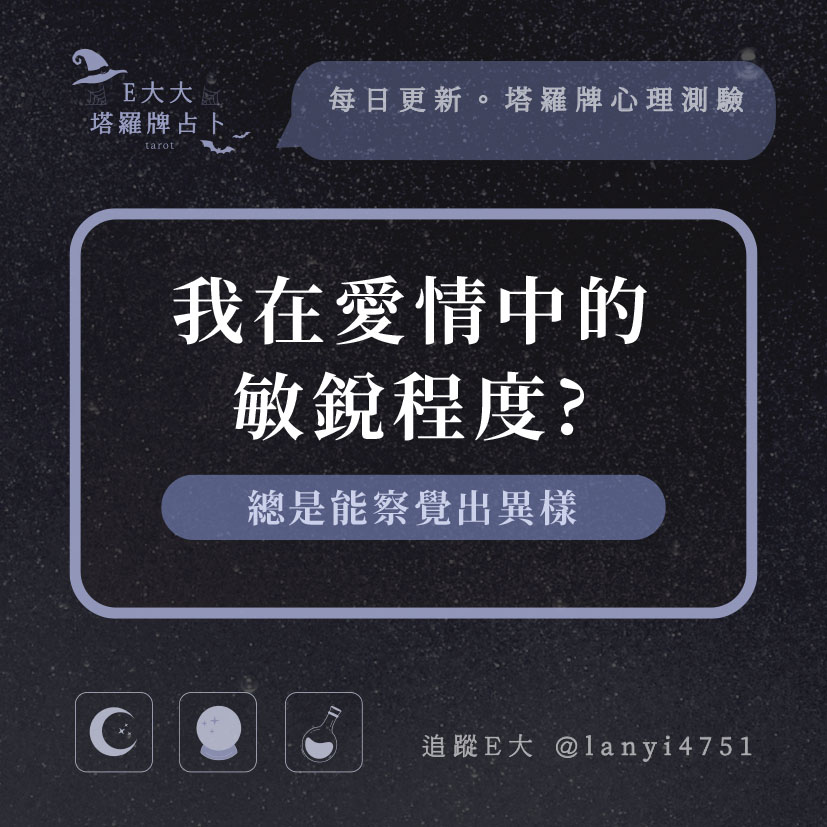 嗨~我是E大,歡迎你來到我的塔羅世界,每天會跟大家分享有趣的塔牌測驗,及塔羅知識喔!