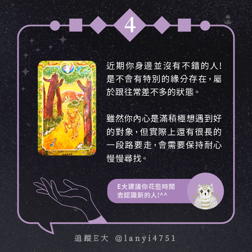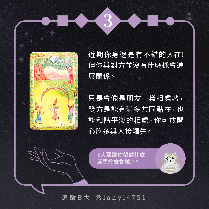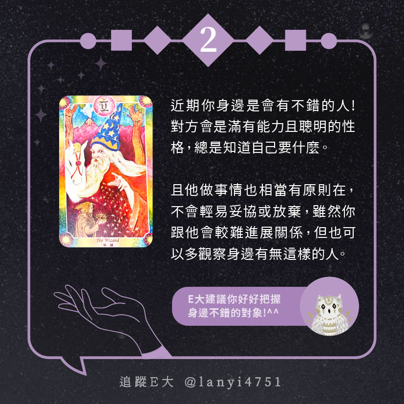 嗨~我是E大,歡迎你來到我的塔羅世界,每天會跟大家分享有趣的塔牌測驗,及塔羅知識喔!