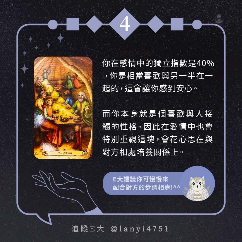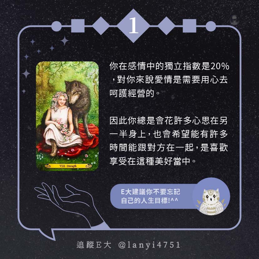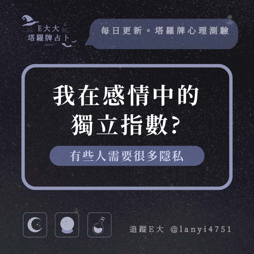 嗨~我是E大,歡迎你來到我的塔羅世界,每天會跟大家分享有趣的塔牌測驗,及塔羅知識喔!