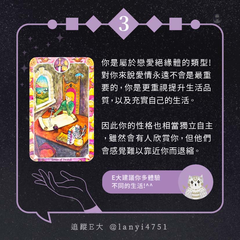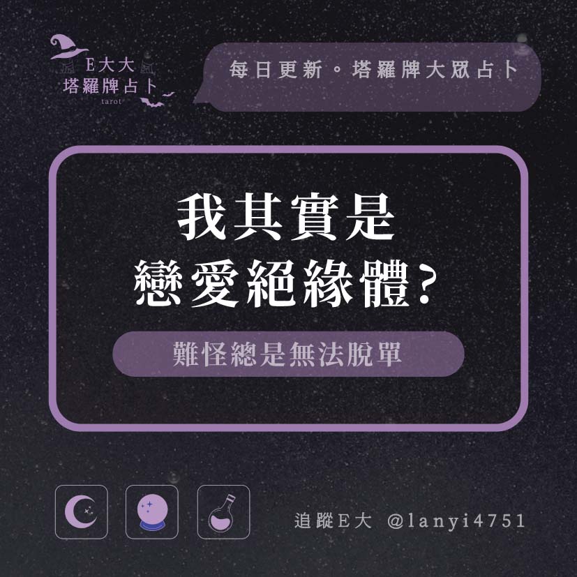 嗨~我是E大,歡迎你來到我的塔羅世界,每天會跟大家分享有趣的塔牌測驗,及塔羅知識喔!