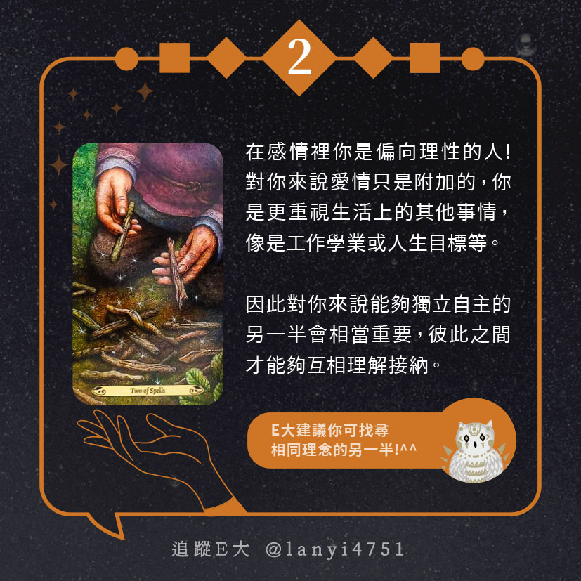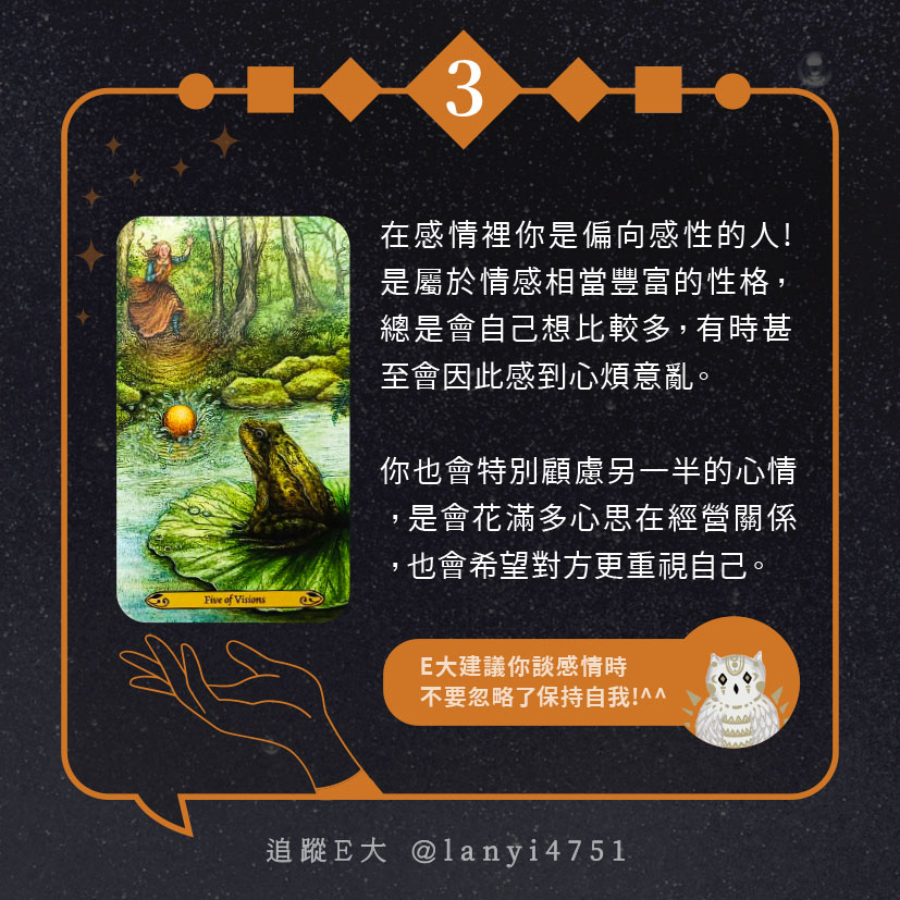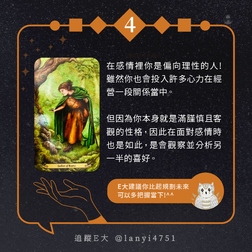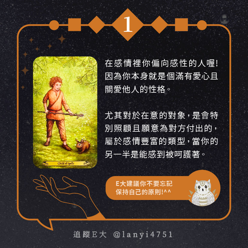嗨~我是E大,歡迎你來到我的塔羅世界,每天會跟大家分享有趣的塔牌測驗,及塔羅知識喔!