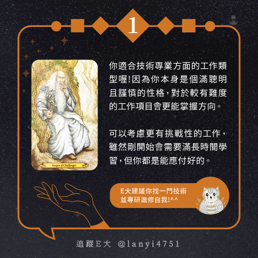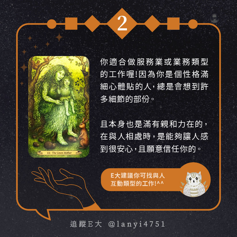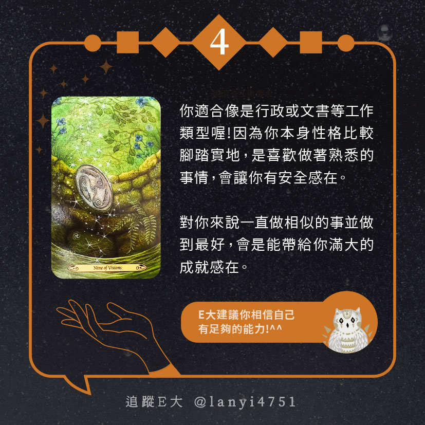 嗨~我是E大,歡迎你來到我的塔羅世界,每天會跟大家分享有趣的塔牌測驗,及塔羅知識喔!