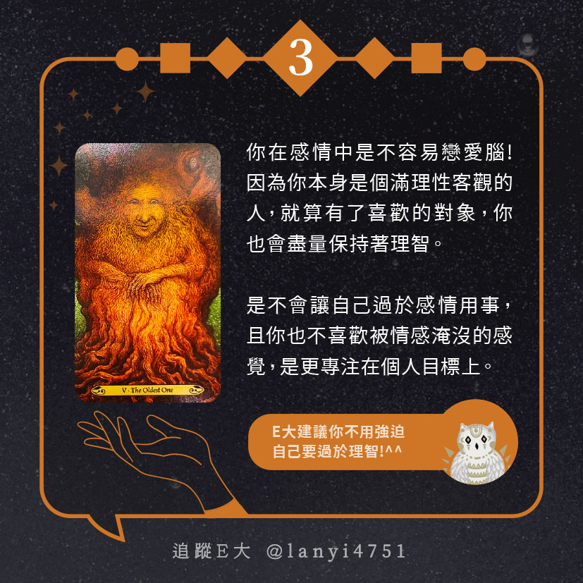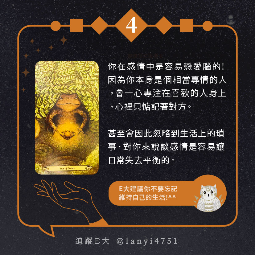 嗨~我是E大,歡迎你來到我的塔羅世界,每天會跟大家分享有趣的塔牌測驗,及塔羅知識喔!