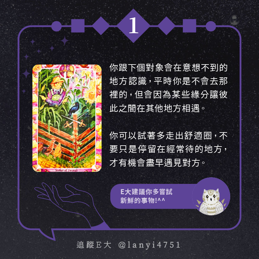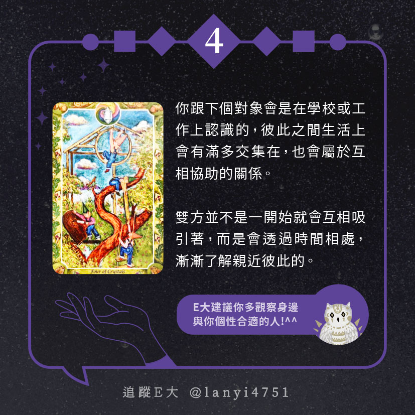 嗨~我是E大,歡迎你來到我的塔羅世界,每天會跟大家分享有趣的塔牌測驗,及塔羅知識喔!