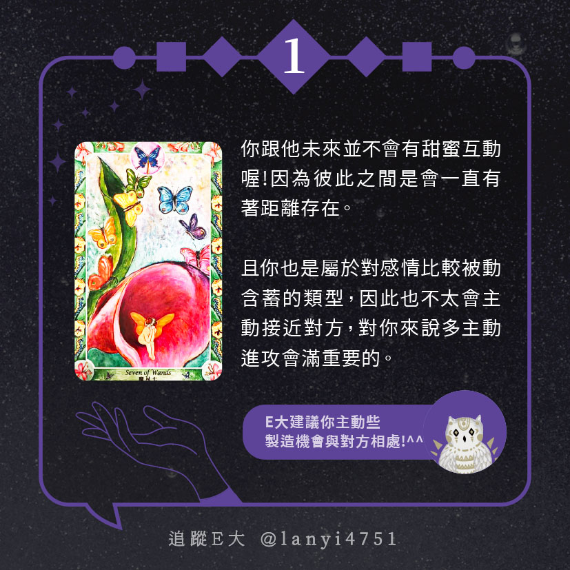 嗨~我是E大,歡迎你來到我的塔羅世界,每天會跟大家分享有趣的塔牌測驗,及塔羅知識喔!
