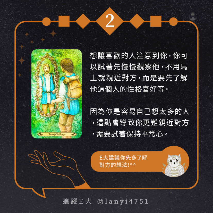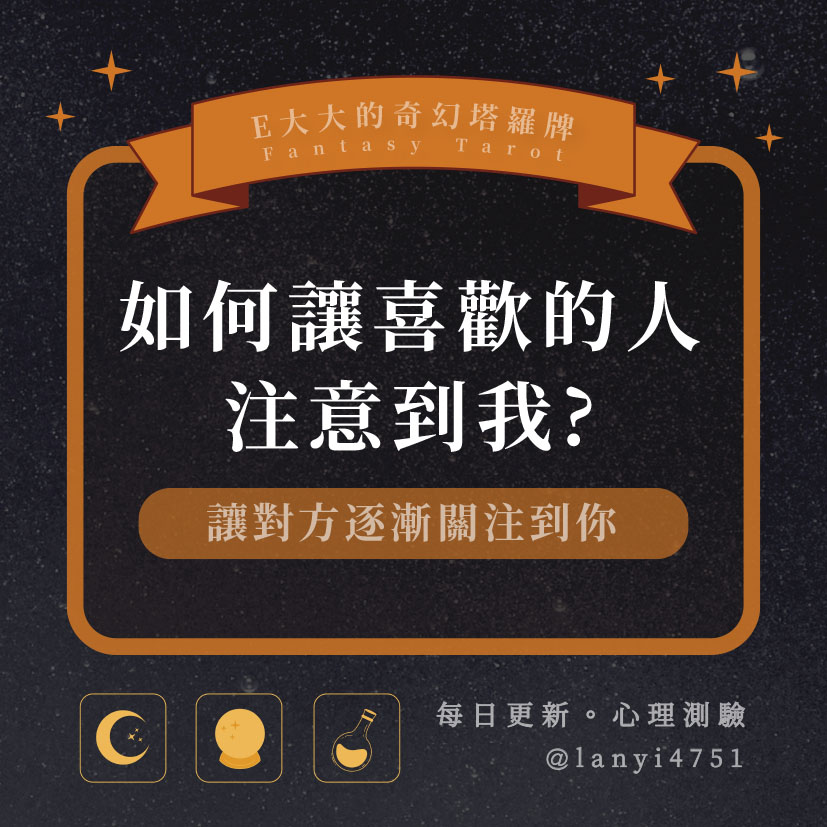 嗨~我是E大,歡迎你來到我的塔羅世界,每天會跟大家分享有趣的塔牌測驗,及塔羅知識喔!