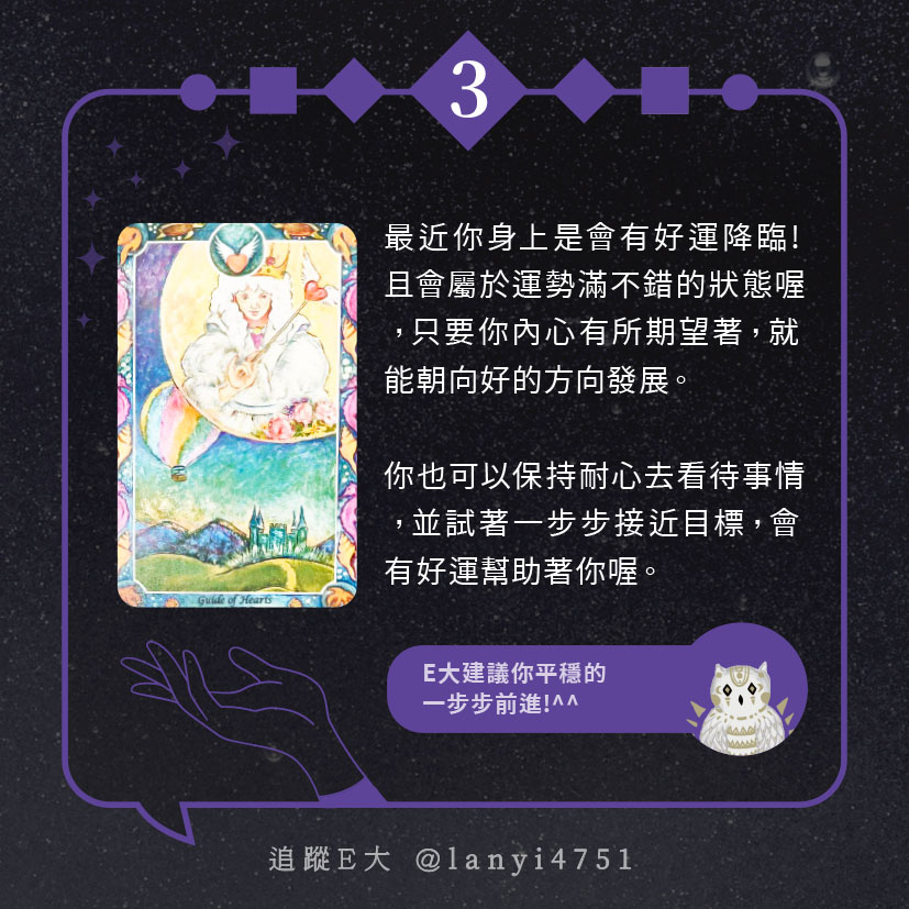嗨~我是E大,歡迎你來到我的塔羅世界,每天會跟大家分享有趣的塔牌測驗,及塔羅知識喔!