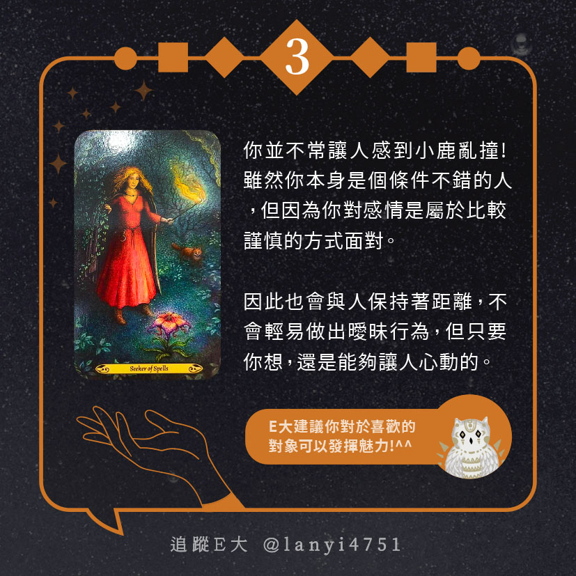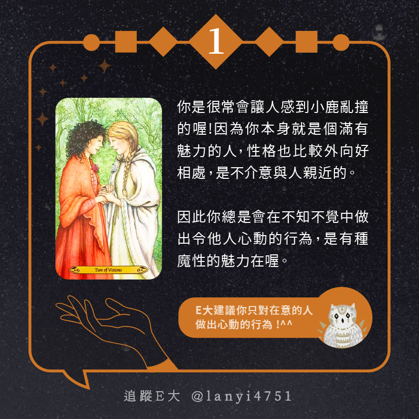 嗨~我是E大,歡迎你來到我的塔羅世界,每天會跟大家分享有趣的塔牌測驗,及塔羅知識喔!