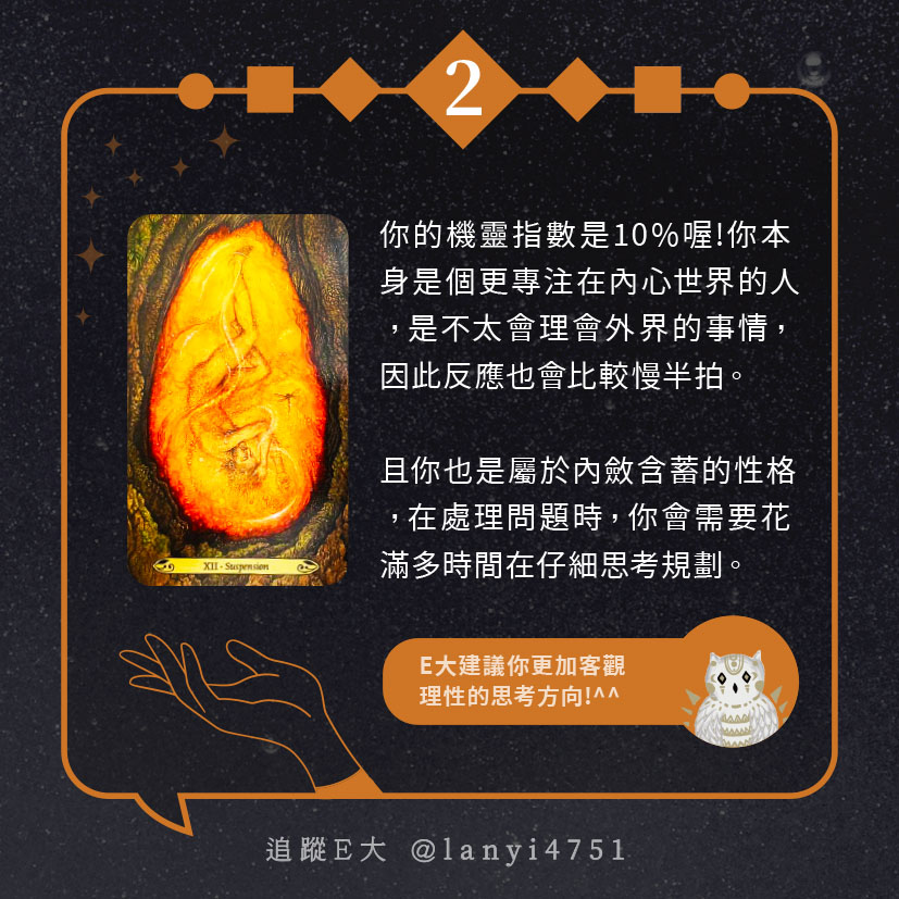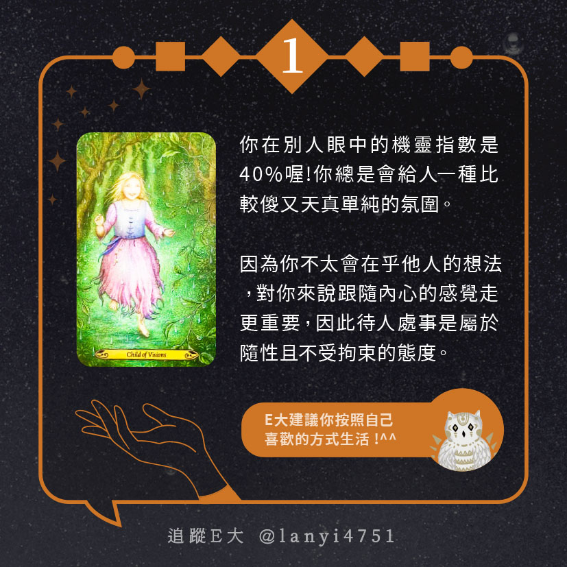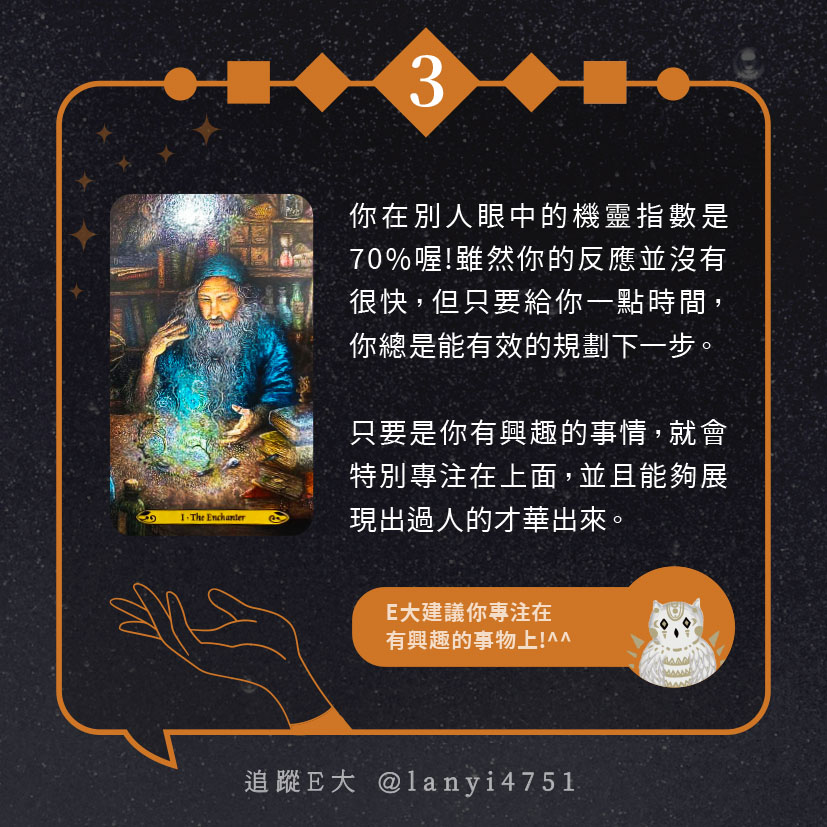 嗨~我是E大,歡迎你來到我的塔羅世界,每天會跟大家分享有趣的塔牌測驗,及塔羅知識喔!