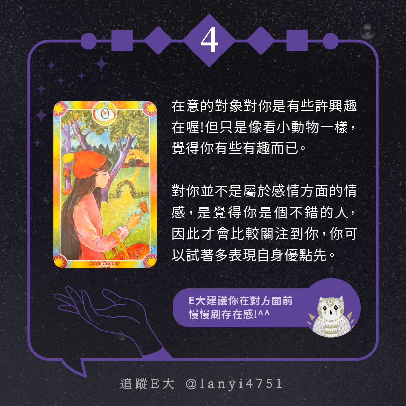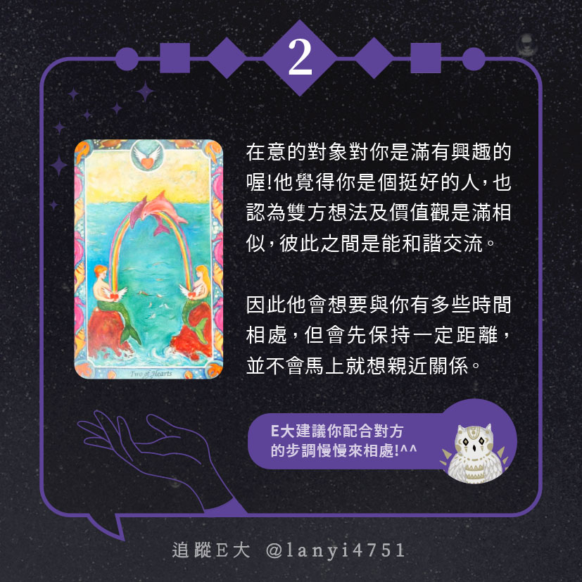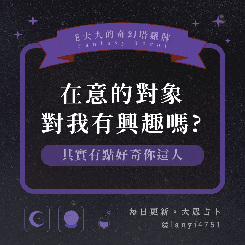 嗨~我是E大,歡迎你來到我的塔羅世界,每天會跟大家分享有趣的塔牌測驗,及塔羅知識喔!
