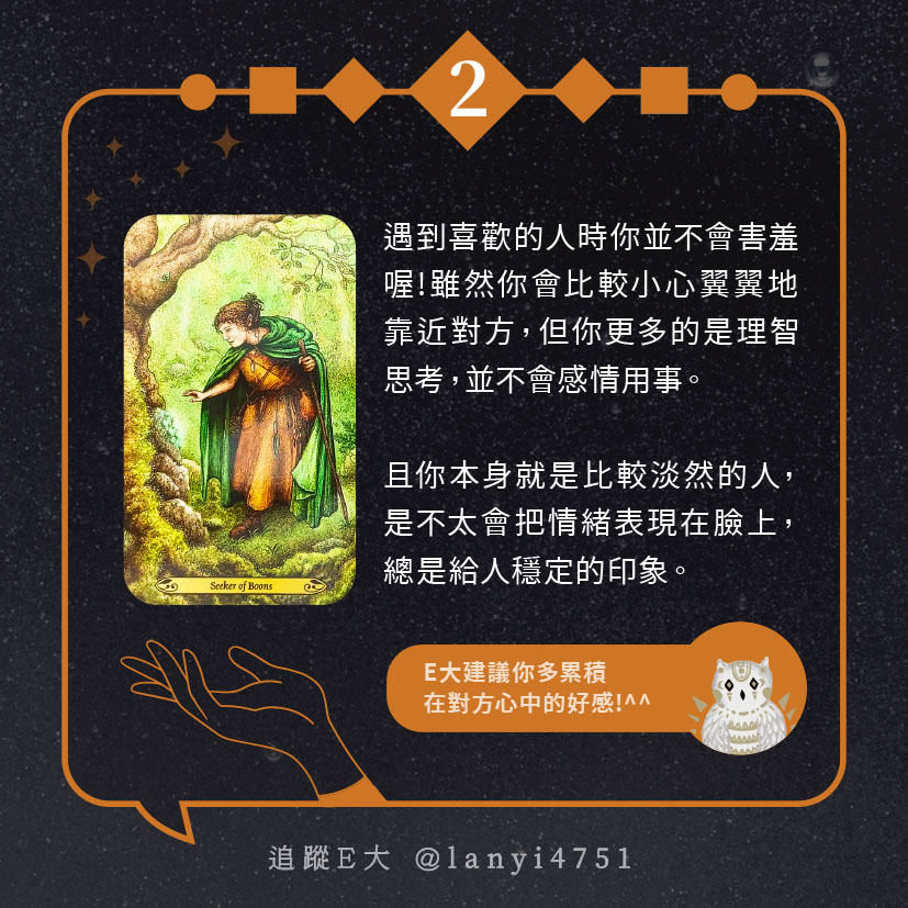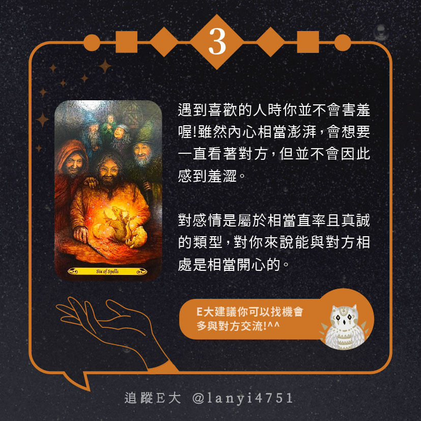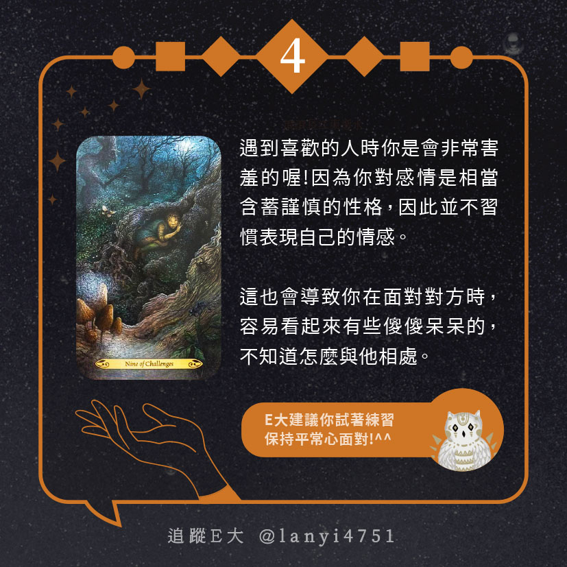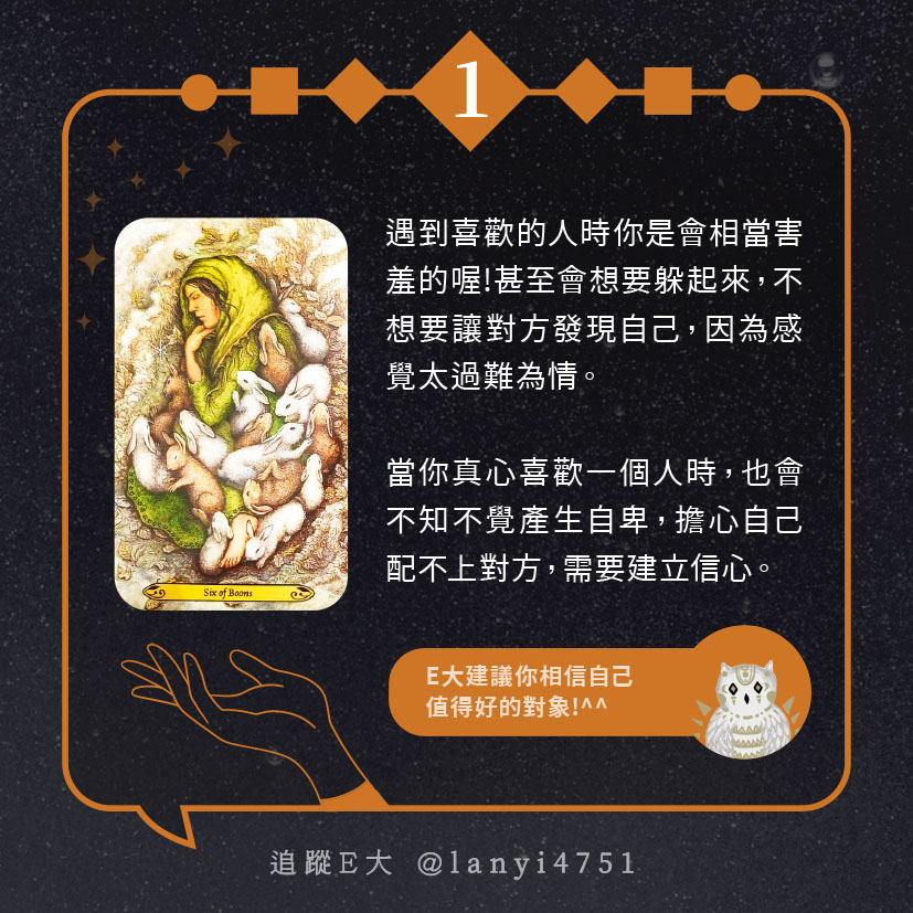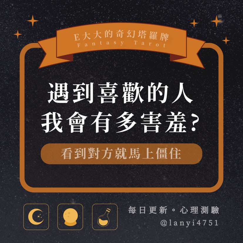 嗨~我是E大,歡迎你來到我的塔羅世界,每天會跟大家分享有趣的塔牌測驗,及塔羅知識喔!