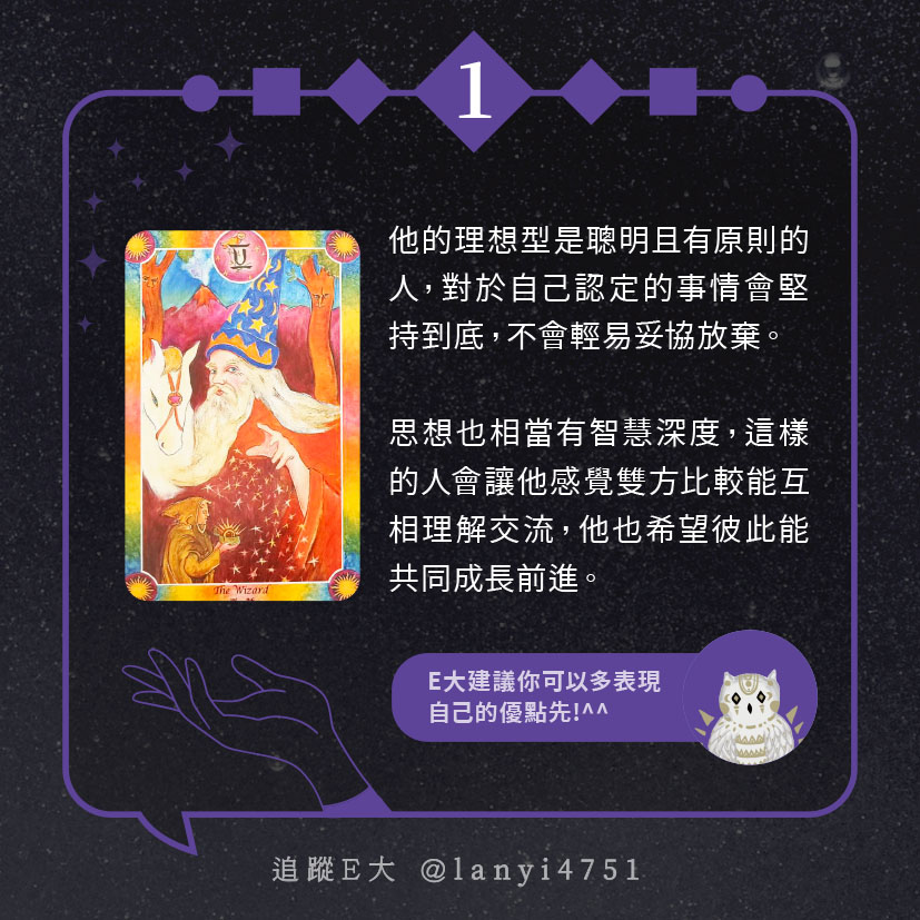 嗨~我是E大,歡迎你來到我的塔羅世界,每天會跟大家分享有趣的塔牌測驗,及塔羅知識喔!