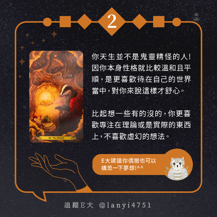 嗨~我是E大,歡迎你來到我的塔羅世界,每天會跟大家分享有趣的塔牌測驗,及塔羅知識喔!