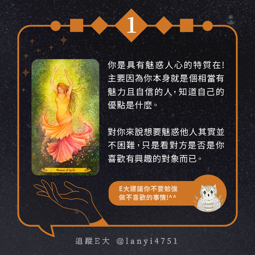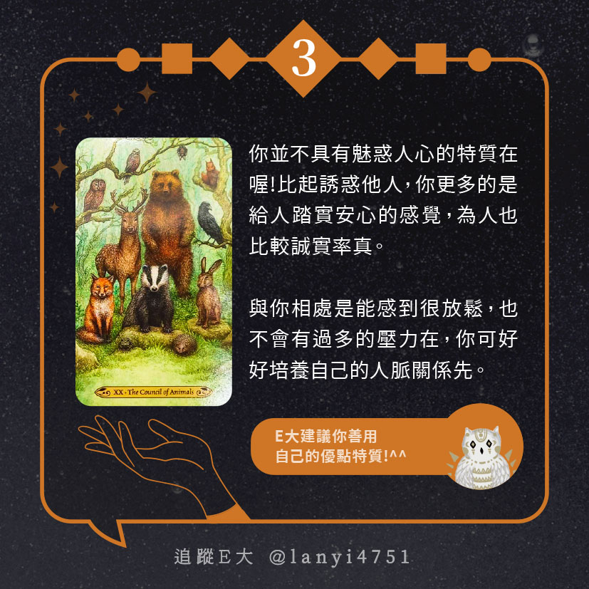 嗨~我是E大,歡迎你來到我的塔羅世界,每天會跟大家分享有趣的塔牌測驗,及塔羅知識喔!