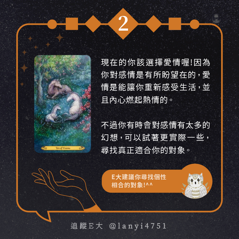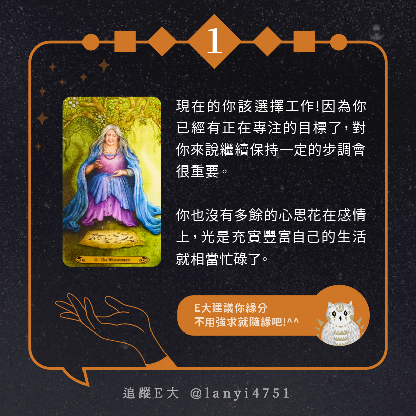 嗨~我是E大,歡迎你來到我的塔羅世界,每天會跟大家分享有趣的塔牌測驗,及塔羅知識喔!