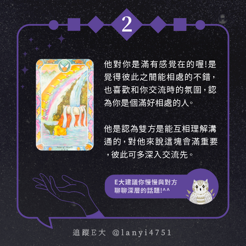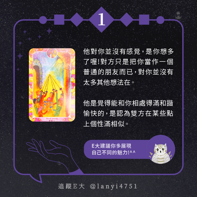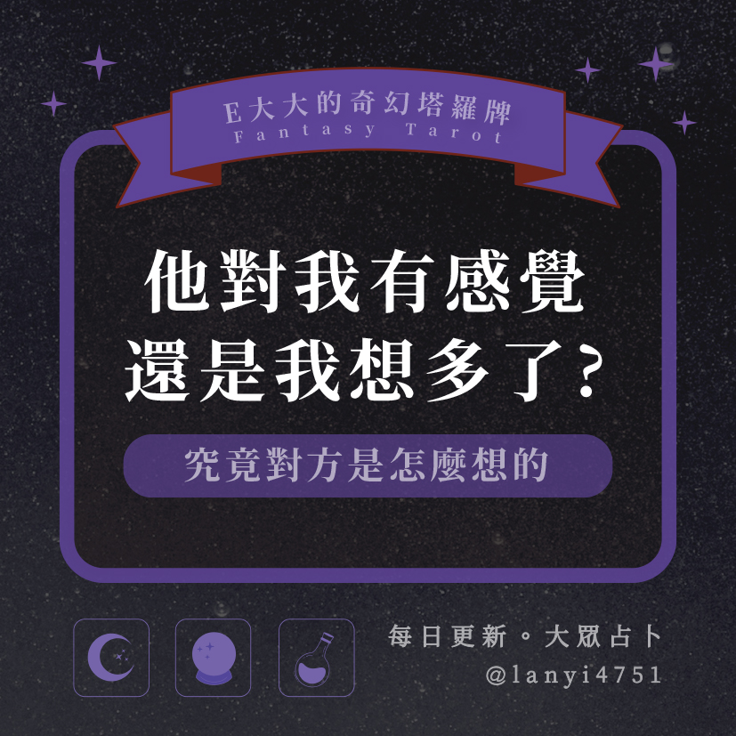 嗨~我是E大,歡迎你來到我的塔羅世界,每天會跟大家分享有趣的塔牌測驗,及塔羅知識喔!