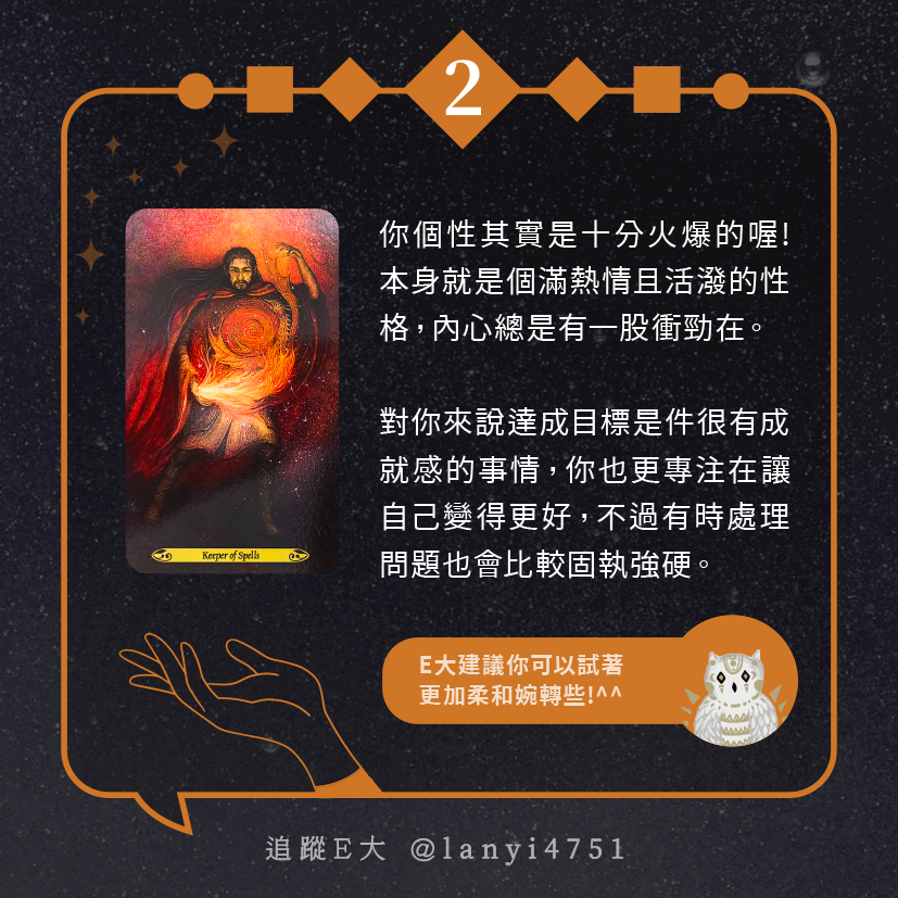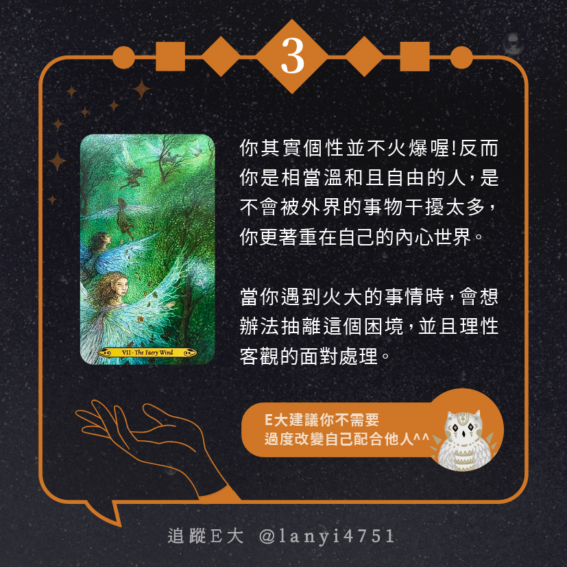 嗨~我是E大,歡迎你來到我的塔羅世界,每天會跟大家分享有趣的塔牌測驗,及塔羅知識喔!