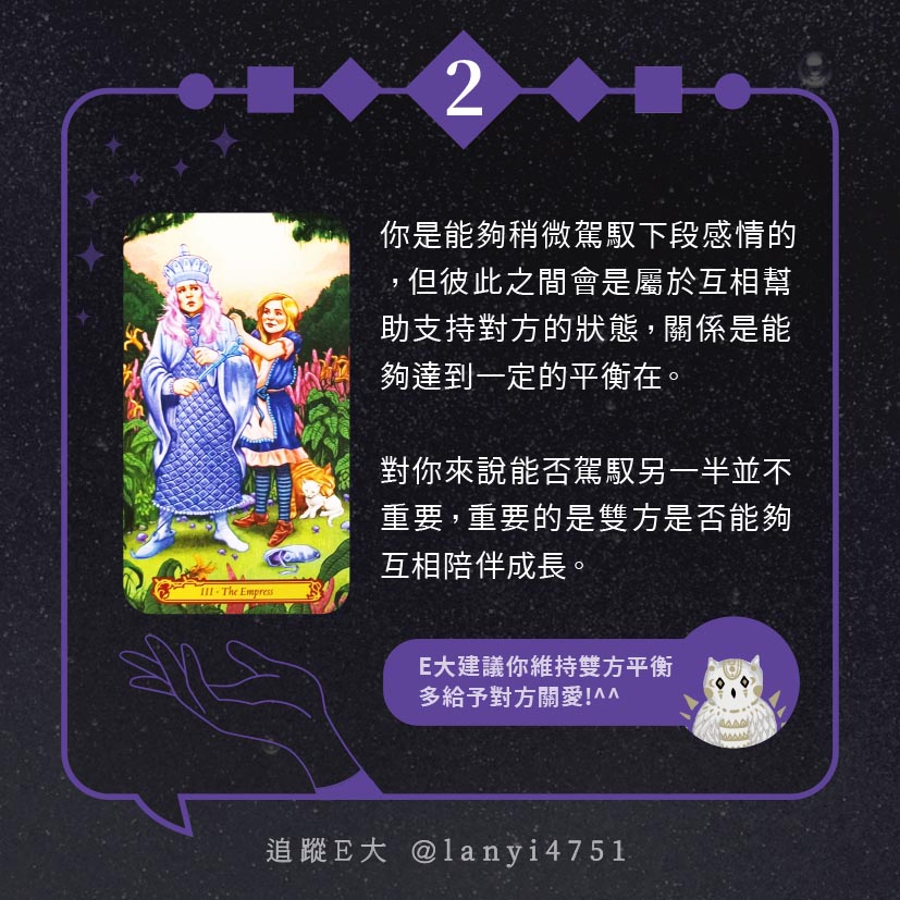 嗨~我是E大,歡迎你來到我的塔羅世界,每天會跟大家分享有趣的塔牌測驗,及塔羅知識喔!